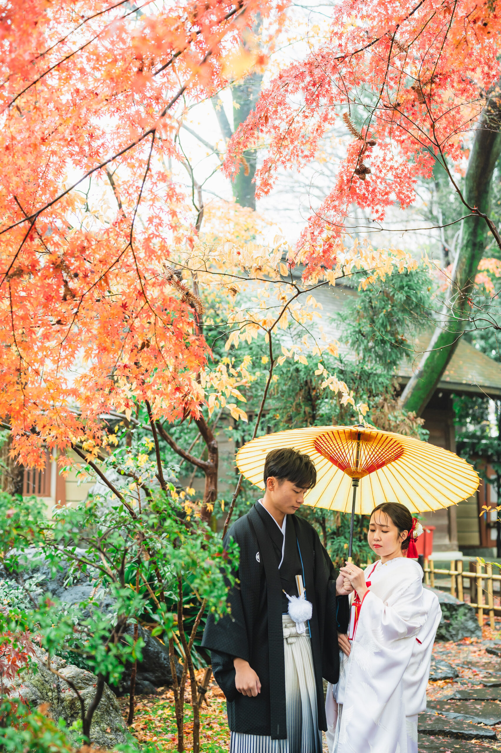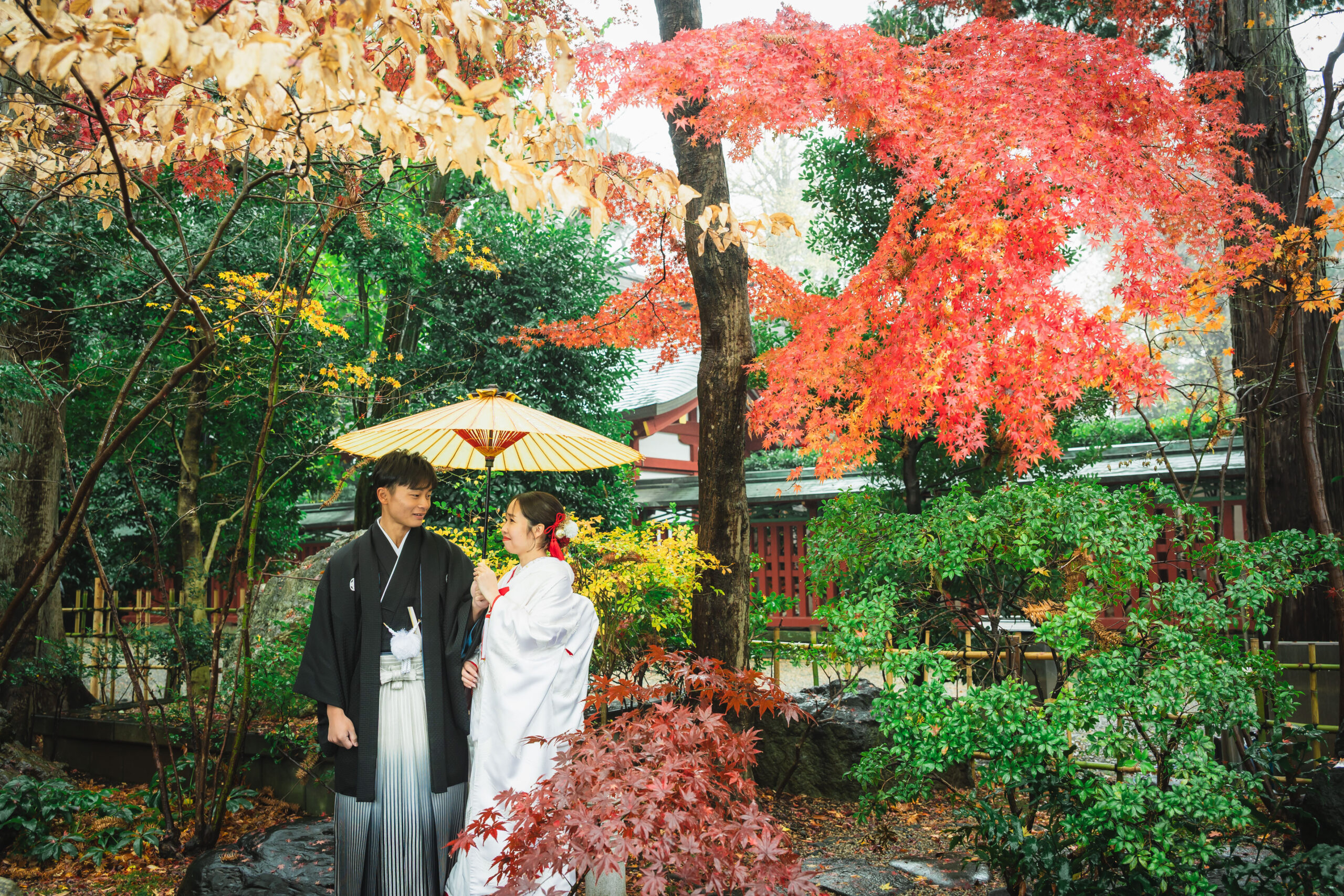 色とりどりの木々の美しさの中に和装のお2人がとても素敵です。