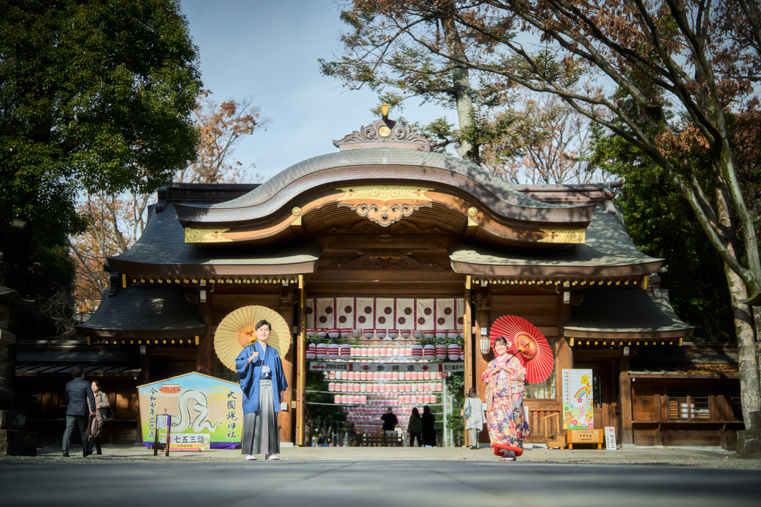秋空と隋神門そして和装のお2人が美しいです。
