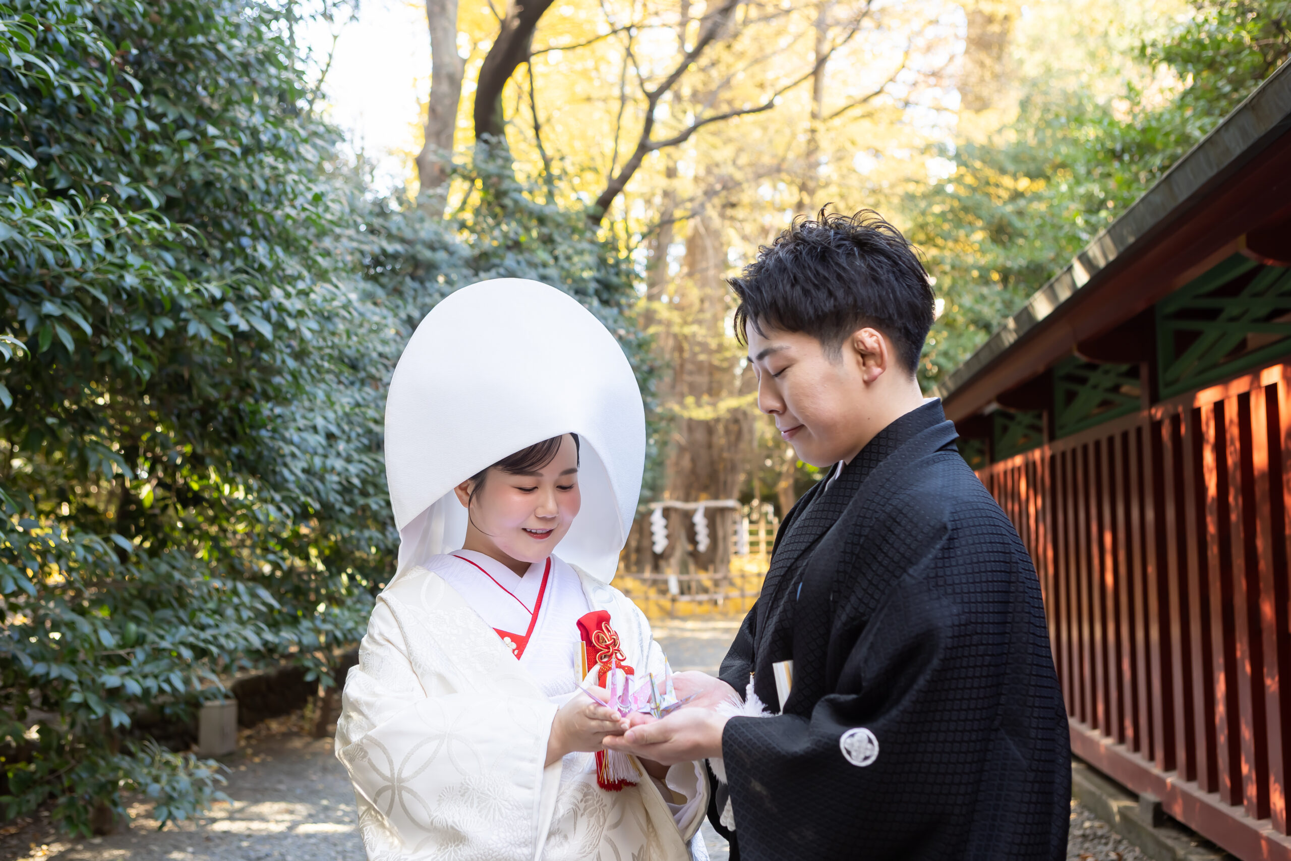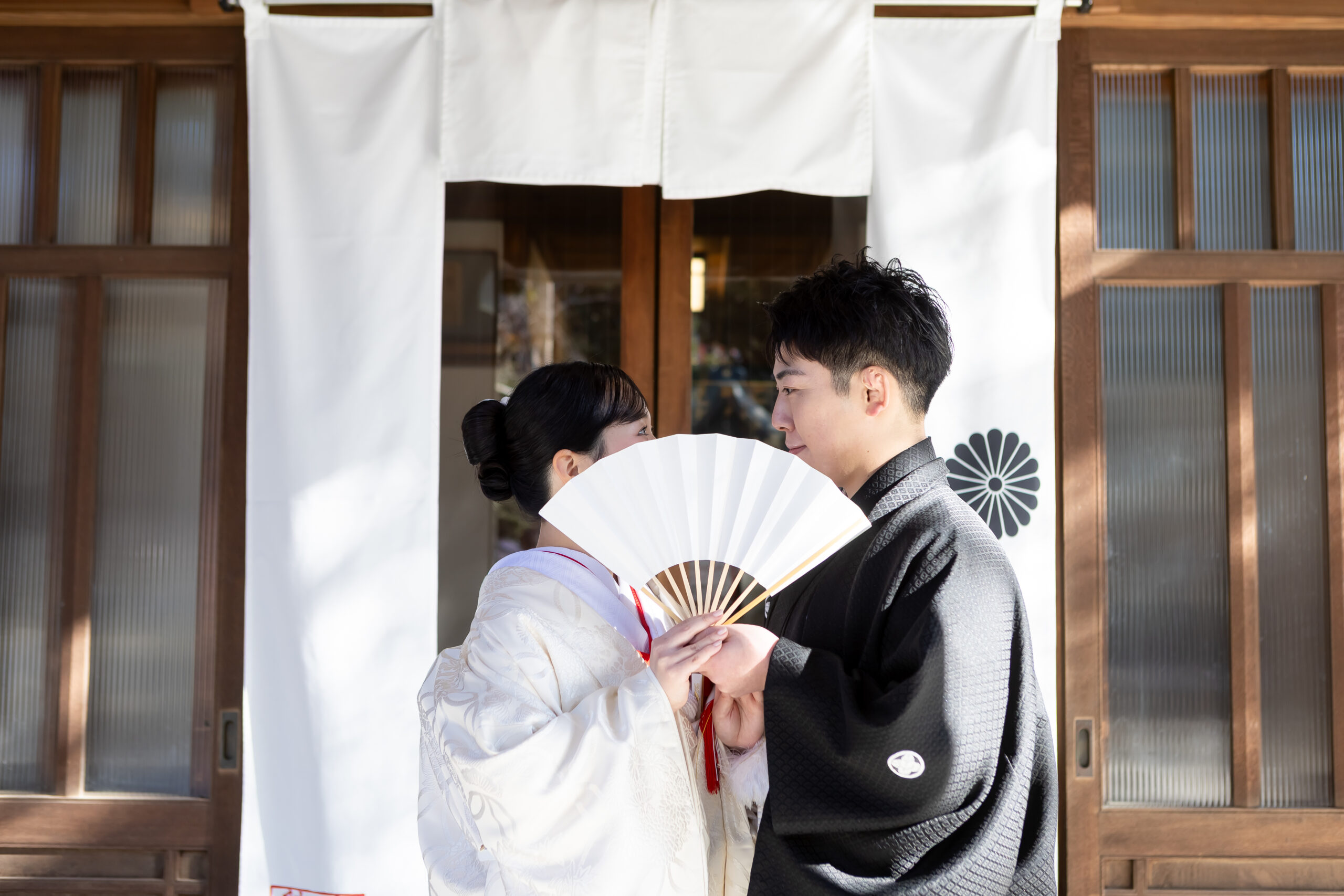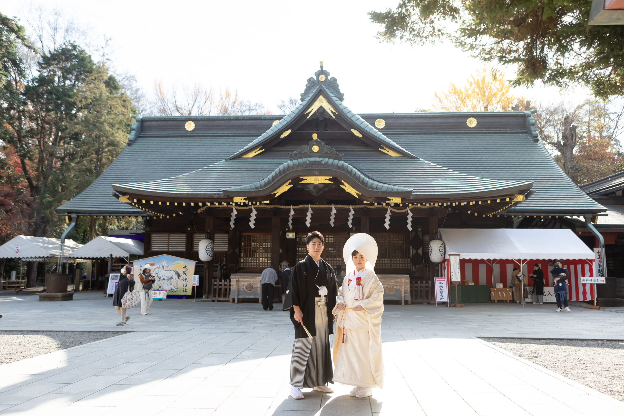 お2人の和装が大國魂神社拝殿に美しく調和します。