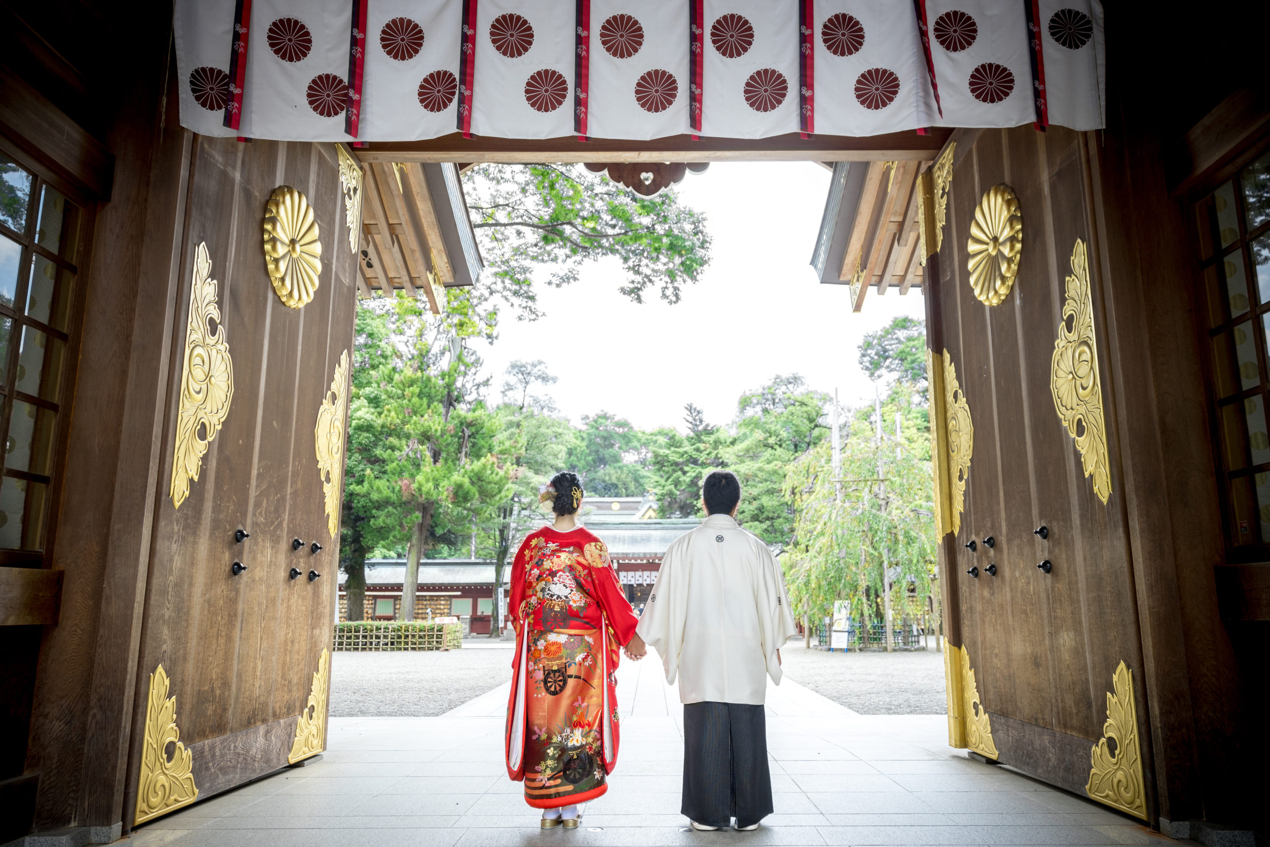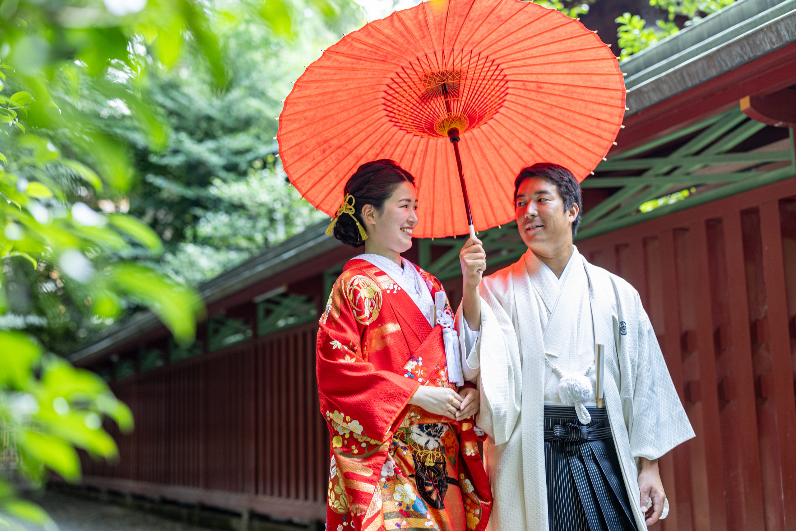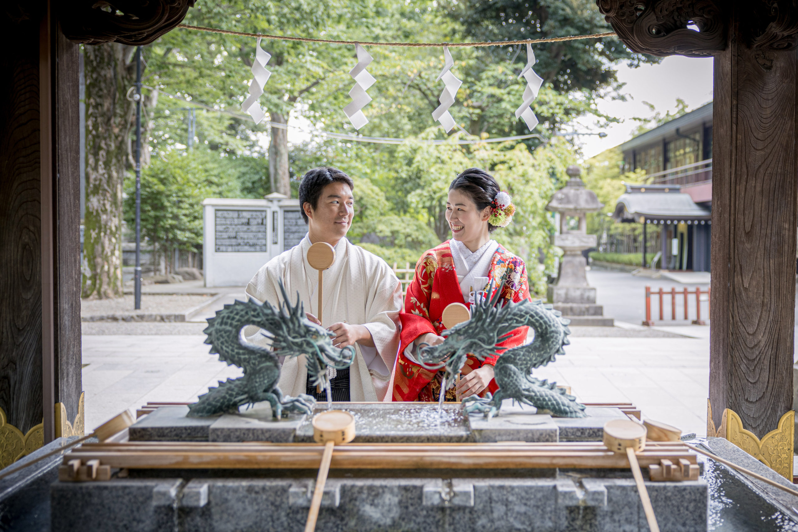 水神社は木々に囲まれた場所です。木漏れ日が優しく照らす和装のお2人が美しい1枚です。