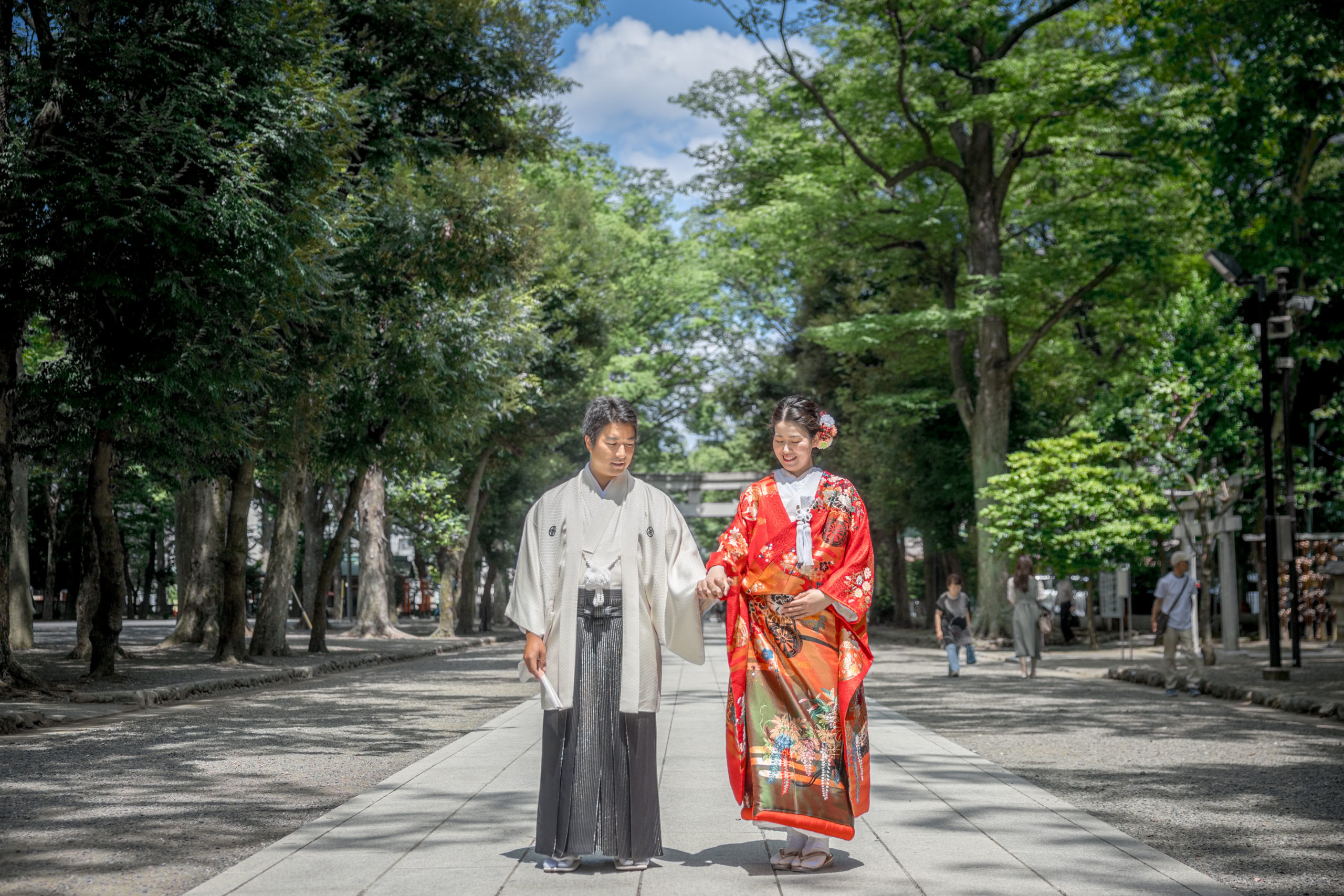 青空と木々の緑、隋神門の雄大さと和装が美しい1枚を撮影させていただきました。