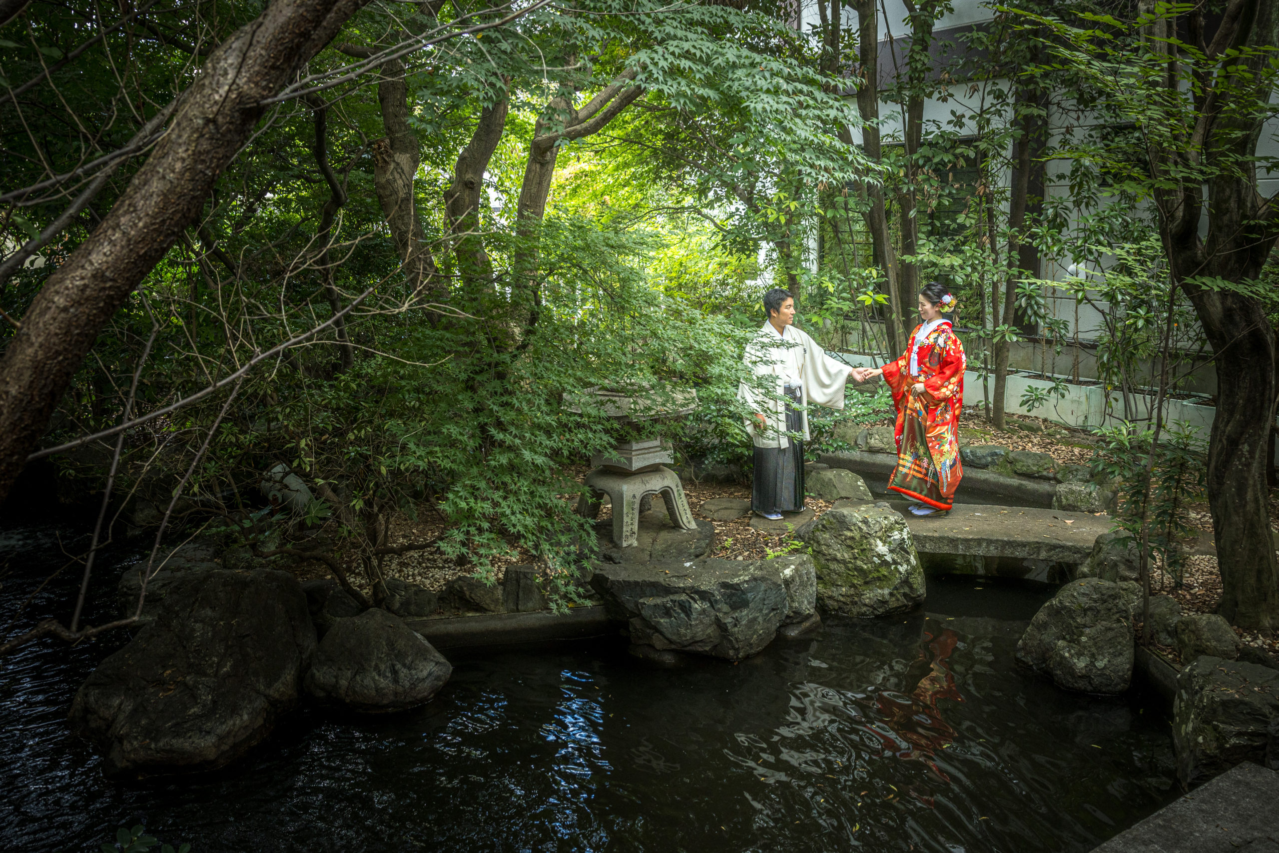 木々と池がある庭園をご新郎様がご新婦様の手をとり歩いているお写真を撮影させていただきました。