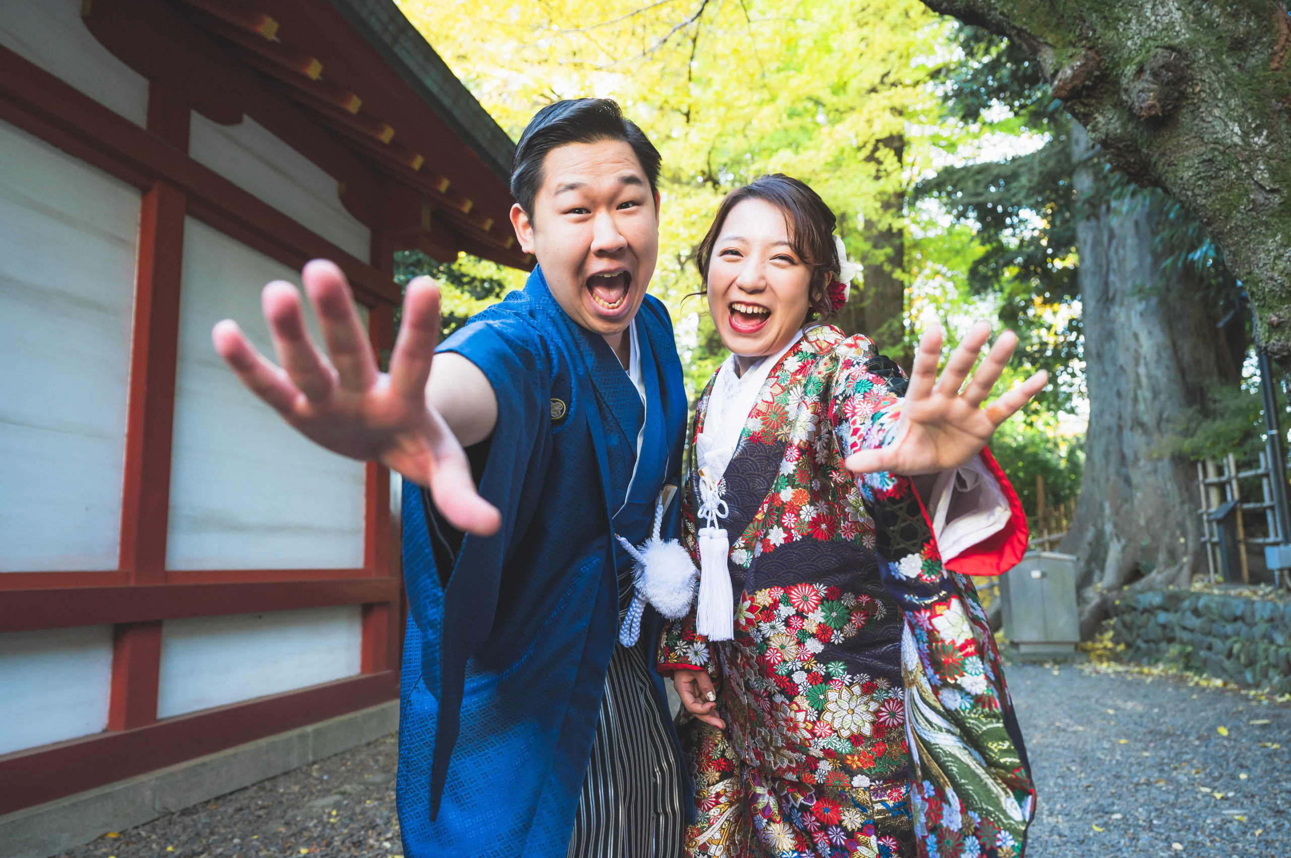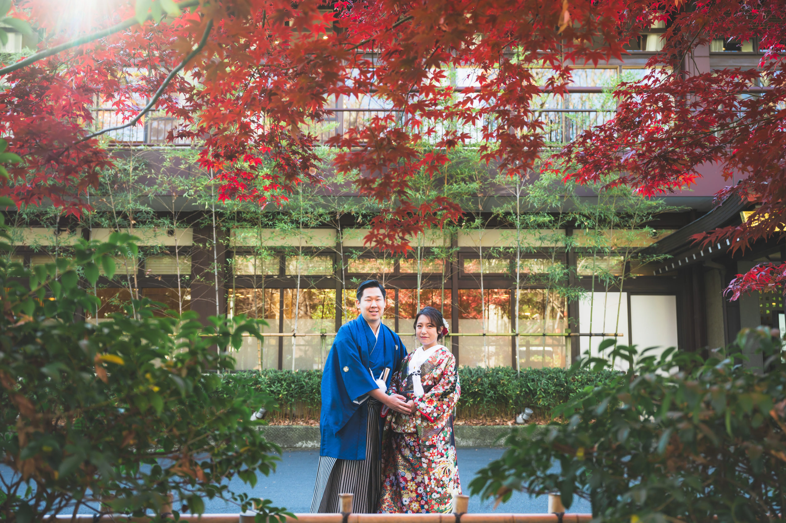 背景の紅葉がお2人の「幸せ」をより強調している1枚です。