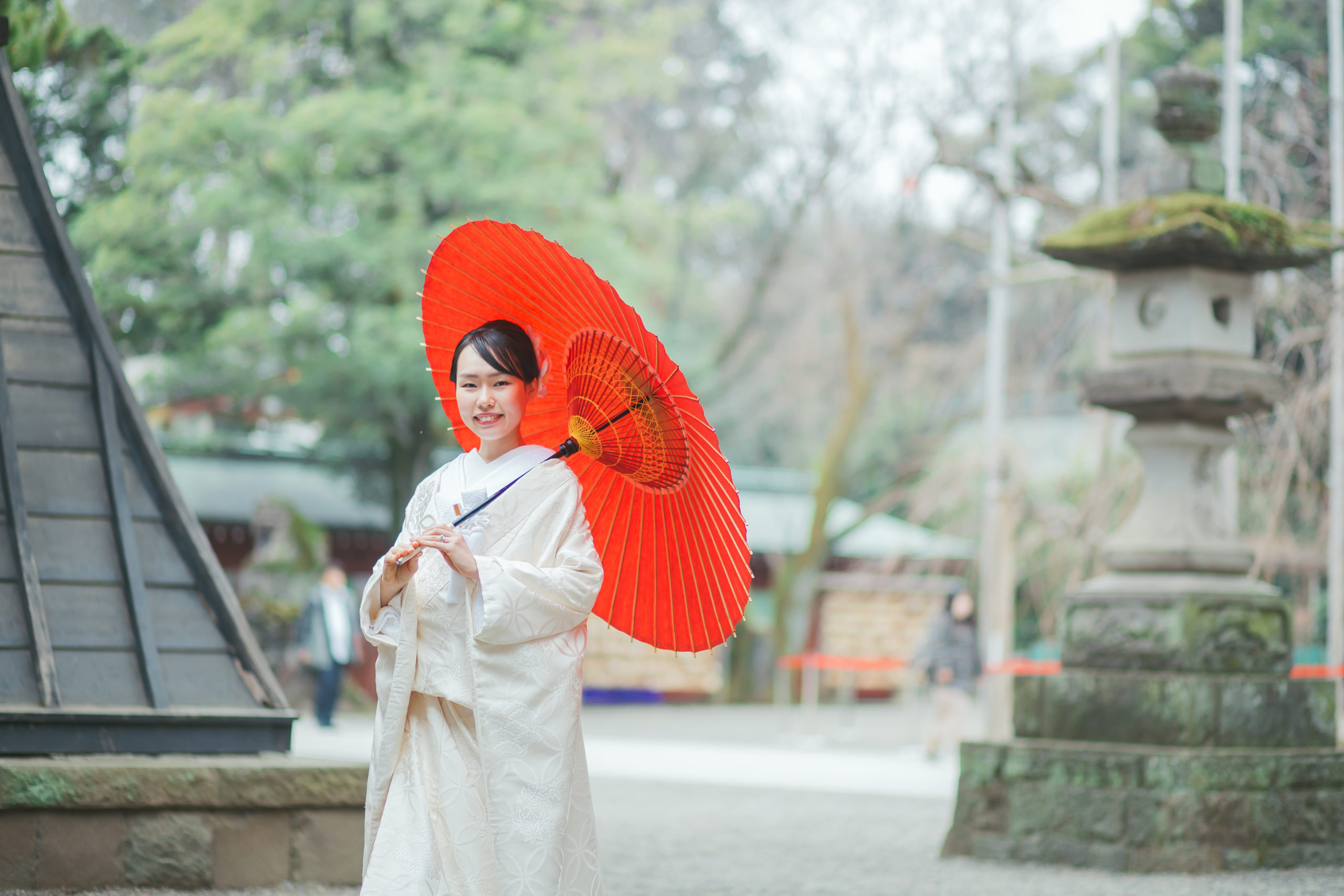 白無垢と赤和傘がとてもお似合いです。