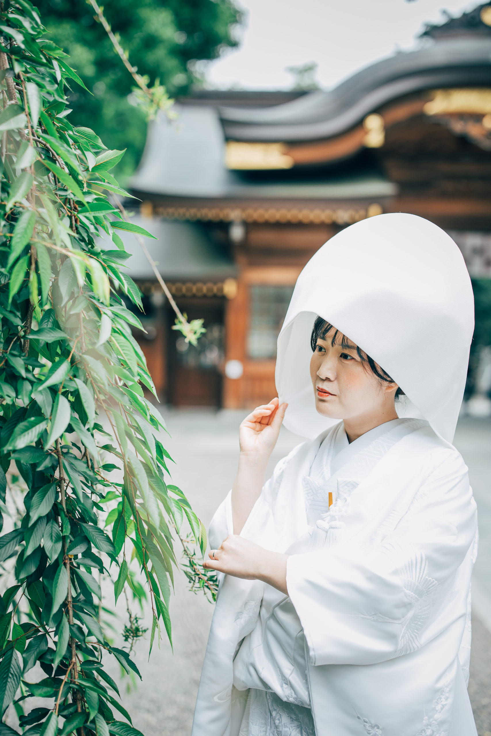 色打掛の華やかさと、緑の深さが美しく調和しています。