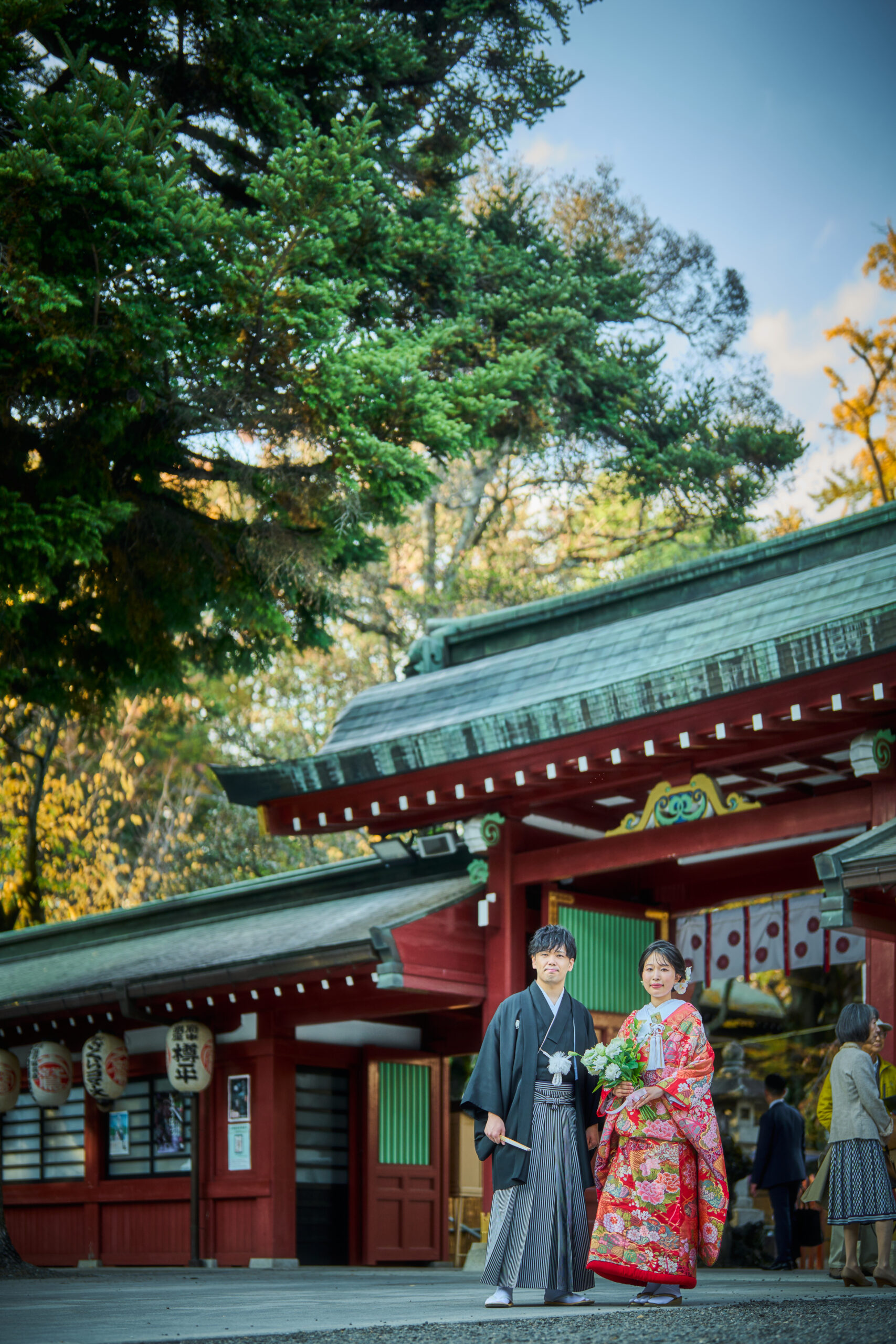 11月の優しい日差し、木漏れ日が赤い色打掛をより引き立てます。
